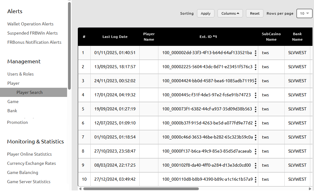 Through the Player Tracking System (PTS), clients can view and manage the status of multiple players in real time. Below is an example screenshot of the actual PTS interface. Click the image to view it in a larger format.